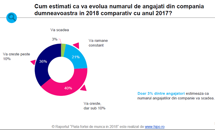 Conform studiului Hipo privind Piata fortei de munca in 2018, la nivel national se inregistreaza schimbari in mai multe sectoare ale pietei fortei de munca, de unde reiese faptul ca majoritatea companiilor au planuri de extindere a echipelor. Doar 3% dintre cei 330 de angajatori intervievati estimeaza ca numarul angajatilor din cadrul companiei va scadea in 2018.